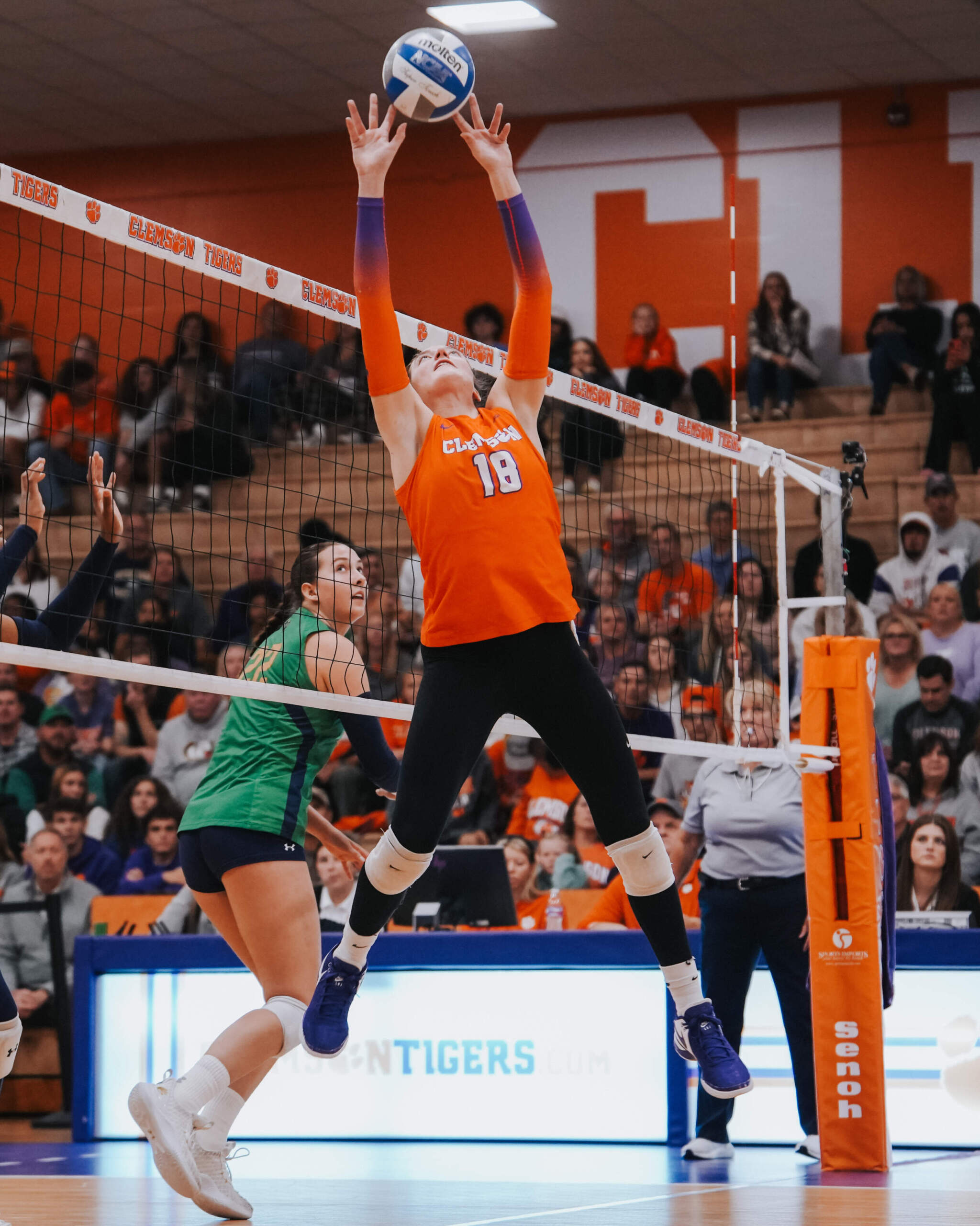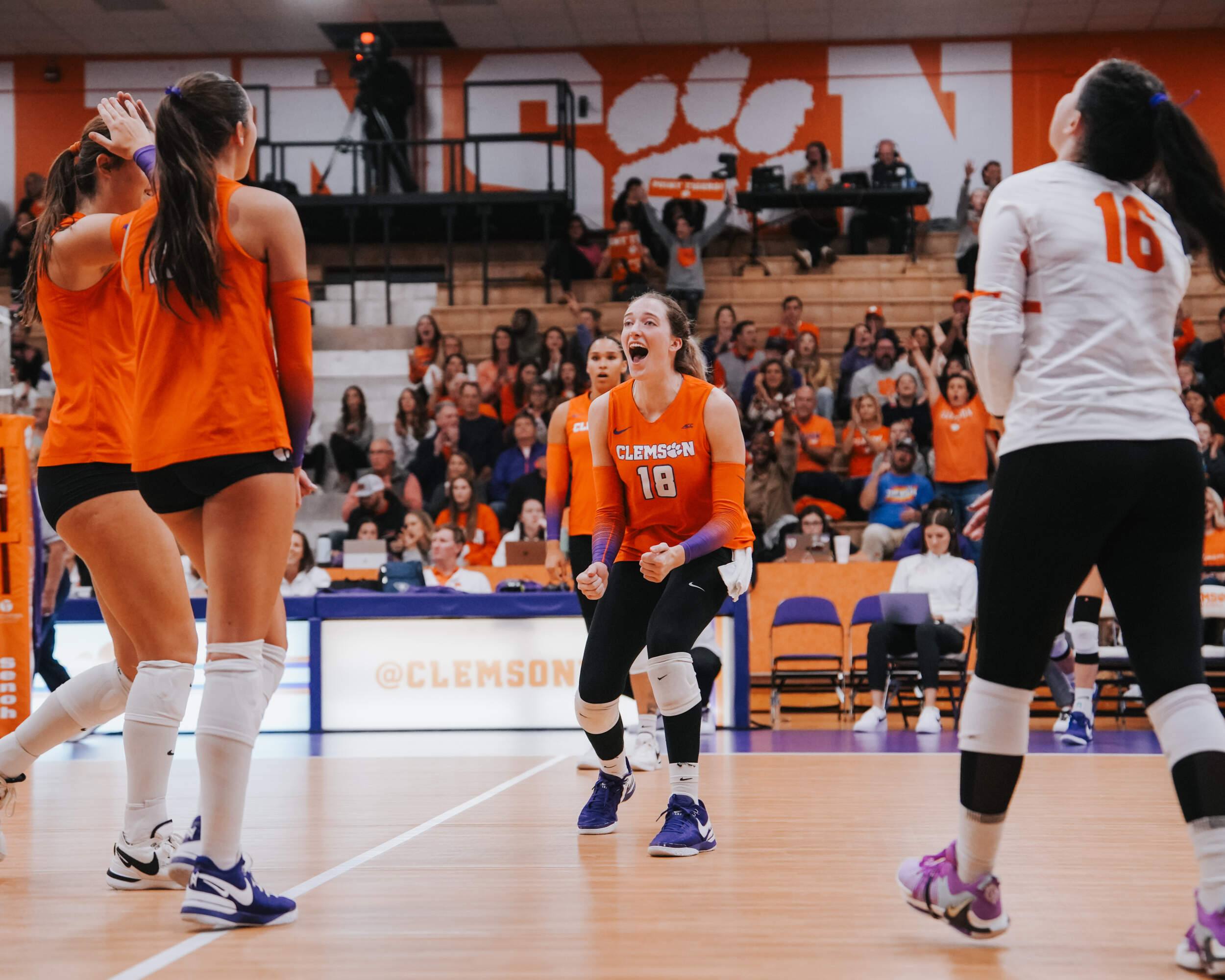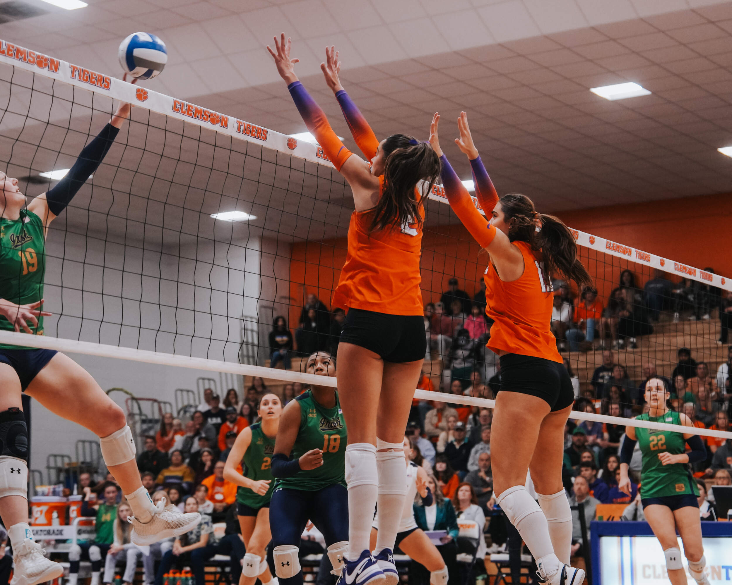 CLEMSON, S.C. – The Clemson Volleyball team captured a four-set victory against Notre Dame inside Jervey Gym on Friday evening. Clemson captured the 3-1 win (28-26, 25-17, 16-25, 25-20) in front of 1,242 fans, the third largest crowd in Jervey Gym this season, and improved to 15-10 (6-7 ACC) on the year. It also marks the first time Clemson has won two-consecutive matches against the Fighting Irish since Clemson won in 2013 and 2014.