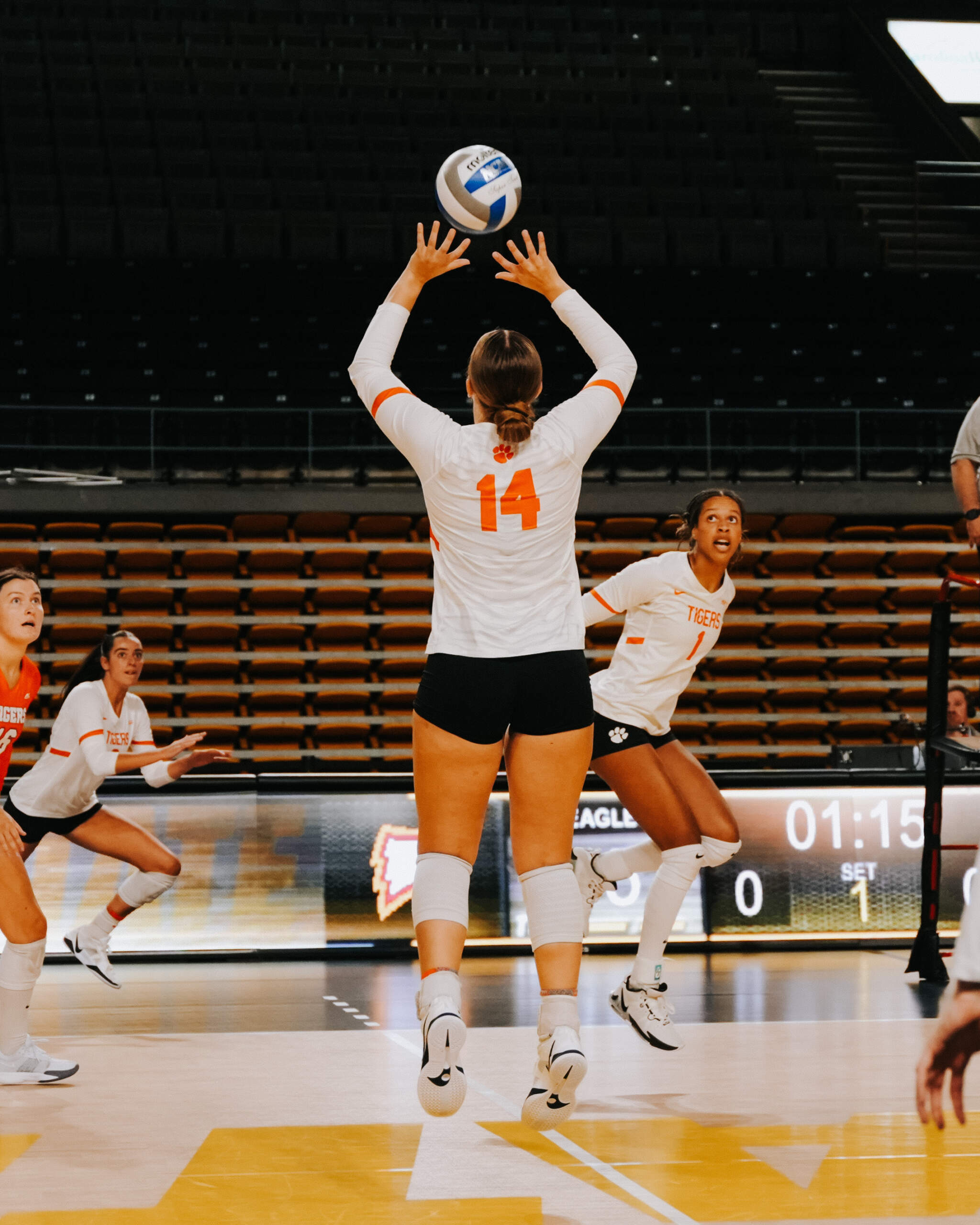 The Tigers entered the final match up the weekend with early scoring runs coming from Taylor and Joki clocking aces and kills. Clemson was also able to take advantage of attack errors by the Eagles, while Kennedy Wagner, Young and Hansen added kills to keep Clemson on pace. The Tigers never conceded the lead as they went on a 7-3 run to win the opening set, 25-19.
