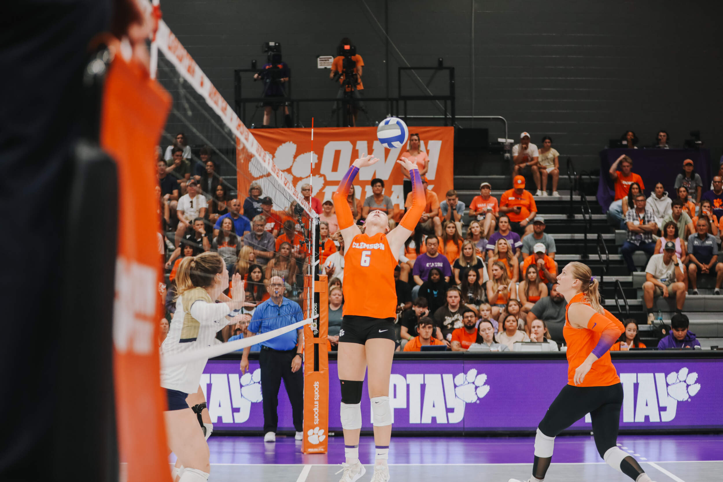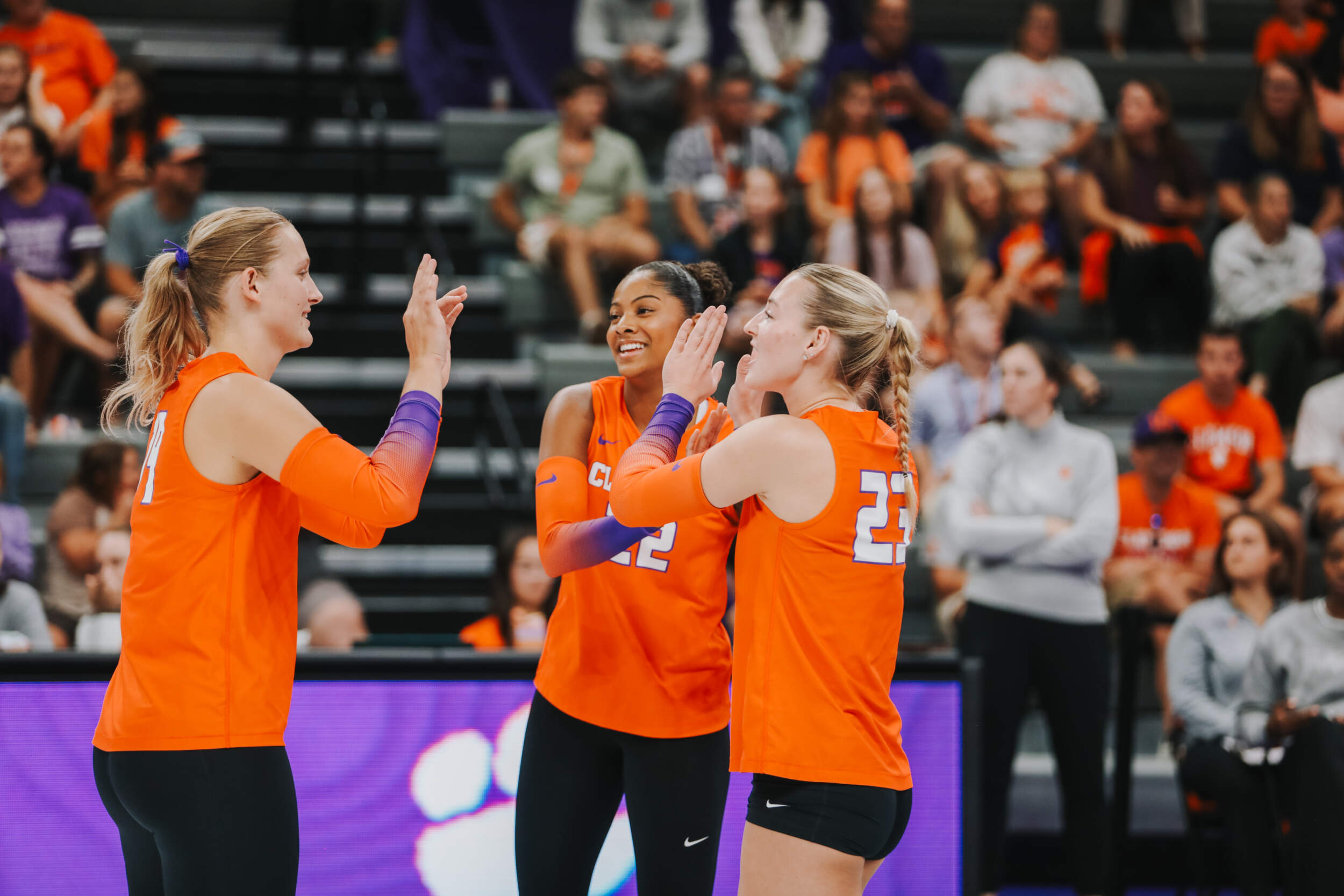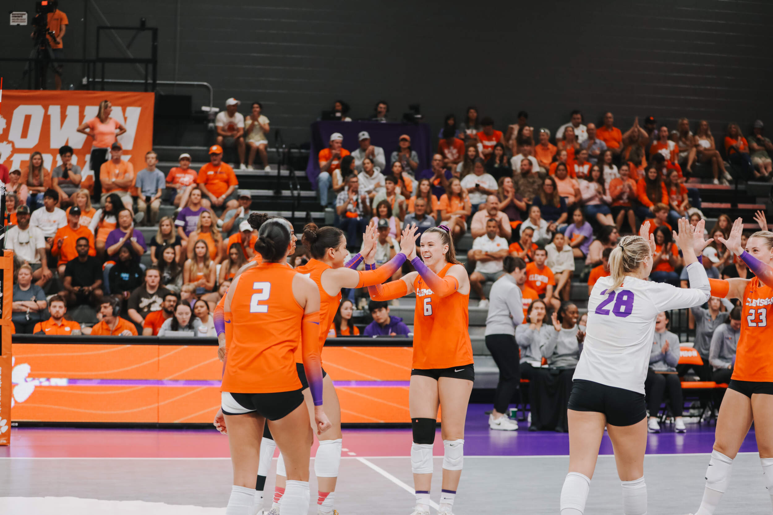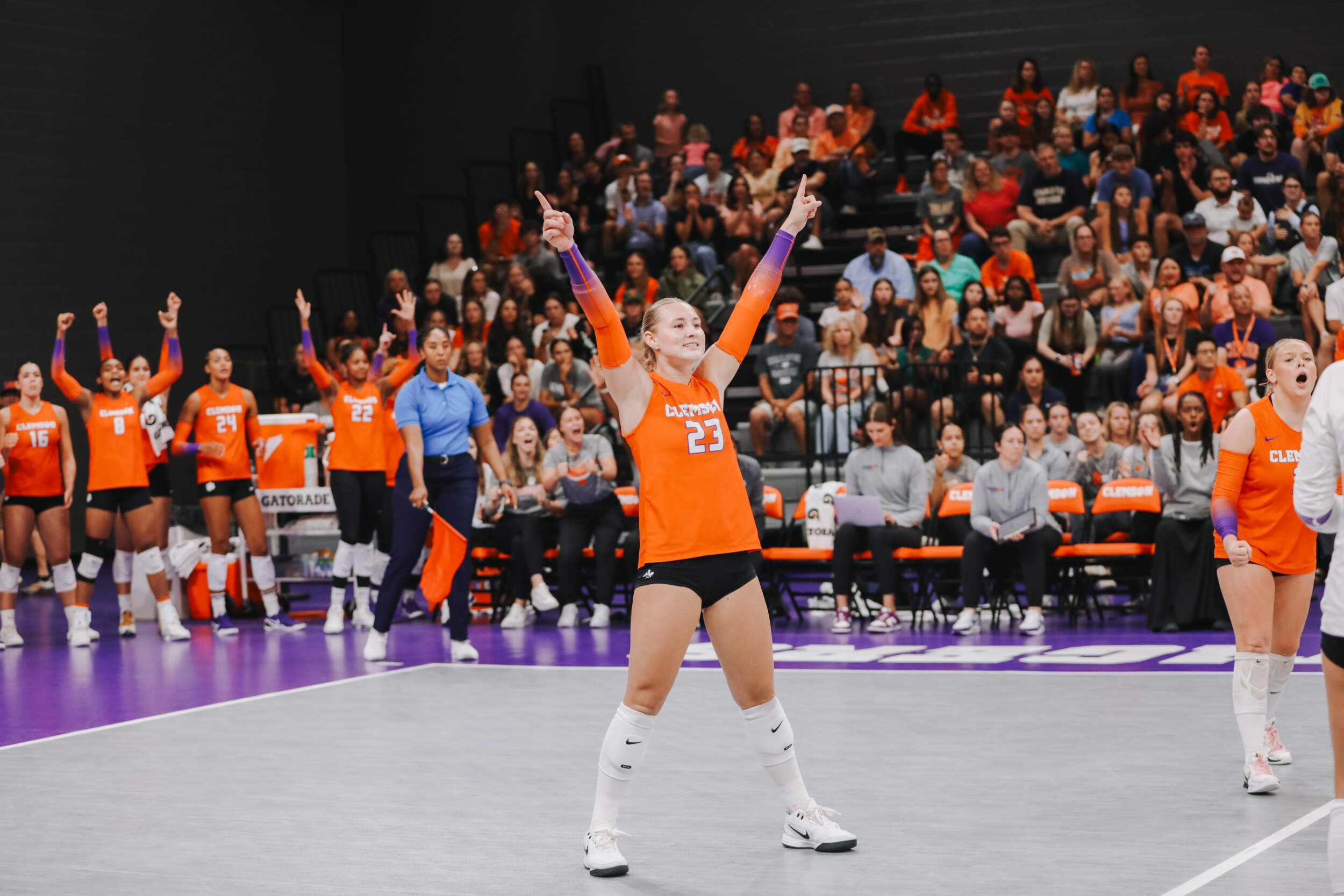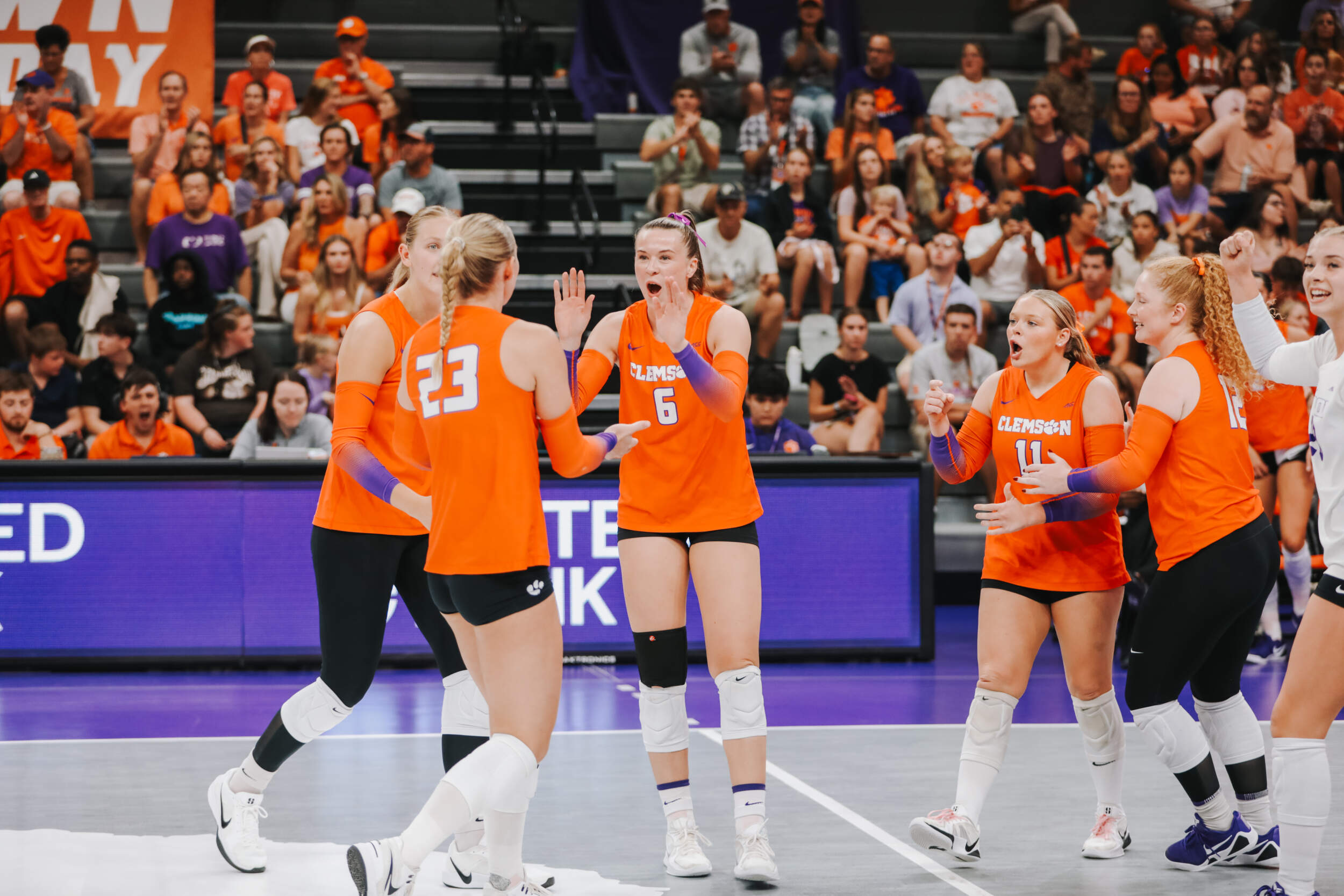 The Tigers started in a dead heat with the Buccaneers in the third set and traded points until it was tied, 9-9. Clemson would then go on an eight-point run powered by a trio of aces from Sandt along with a kill and solo block by Okur. A pair of kills by Hansen, an ace by Addi Rains and a kill each from Sandt and McGrath would put the Tigers on a five-point run to claim the set, 25-13.
