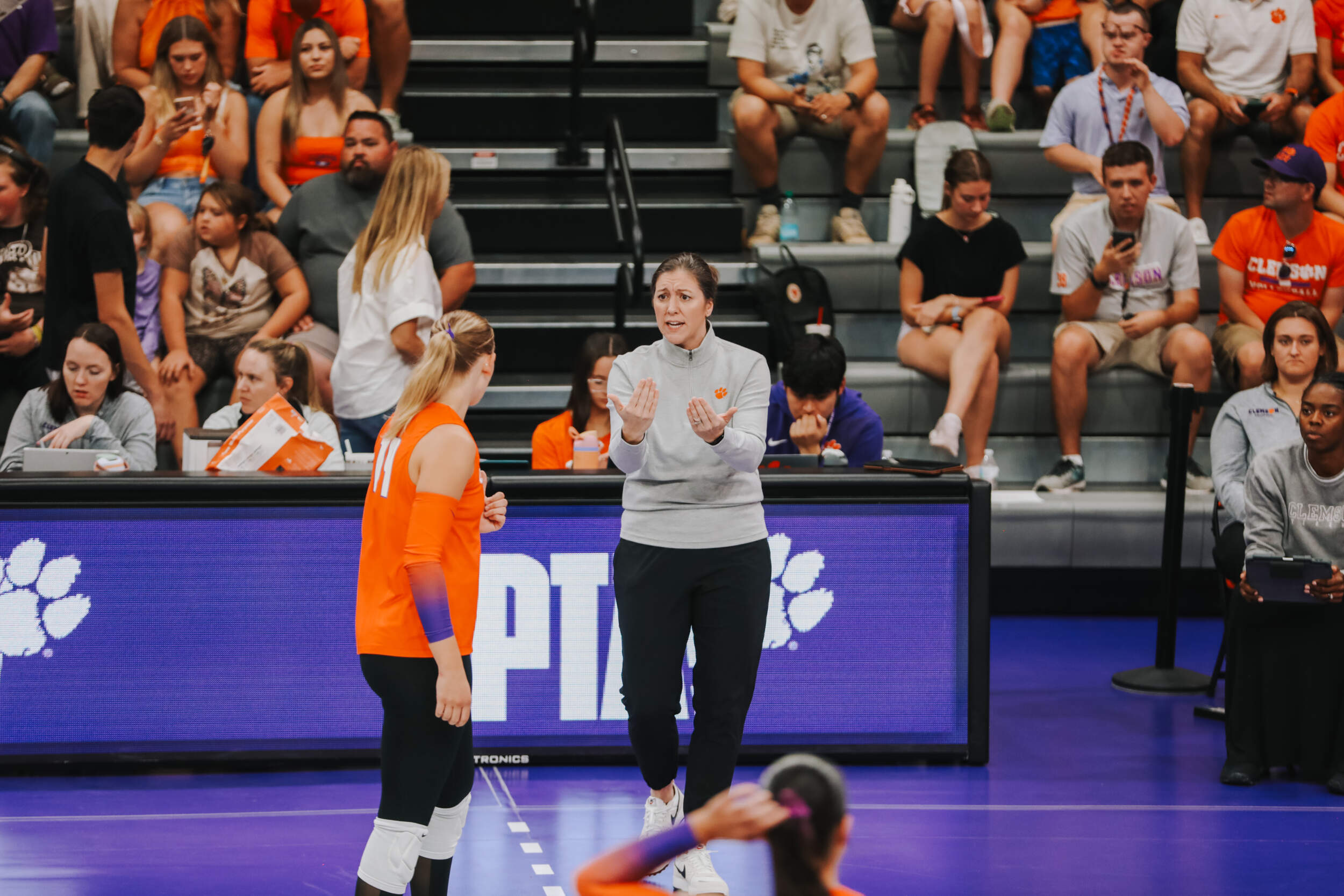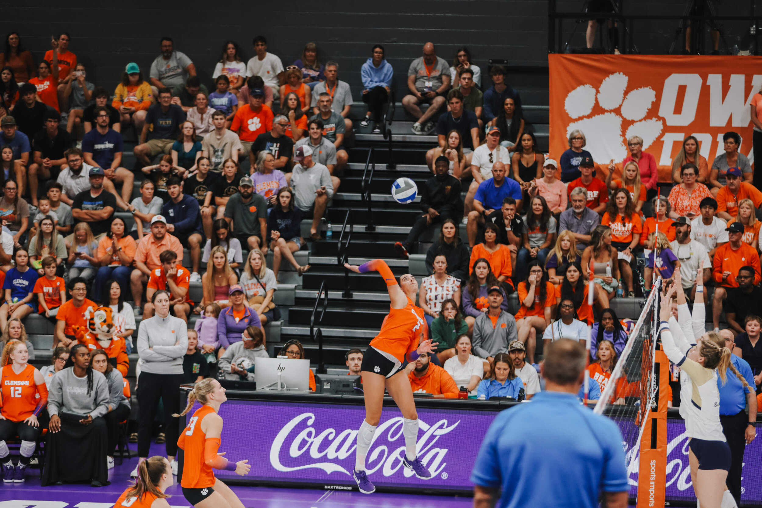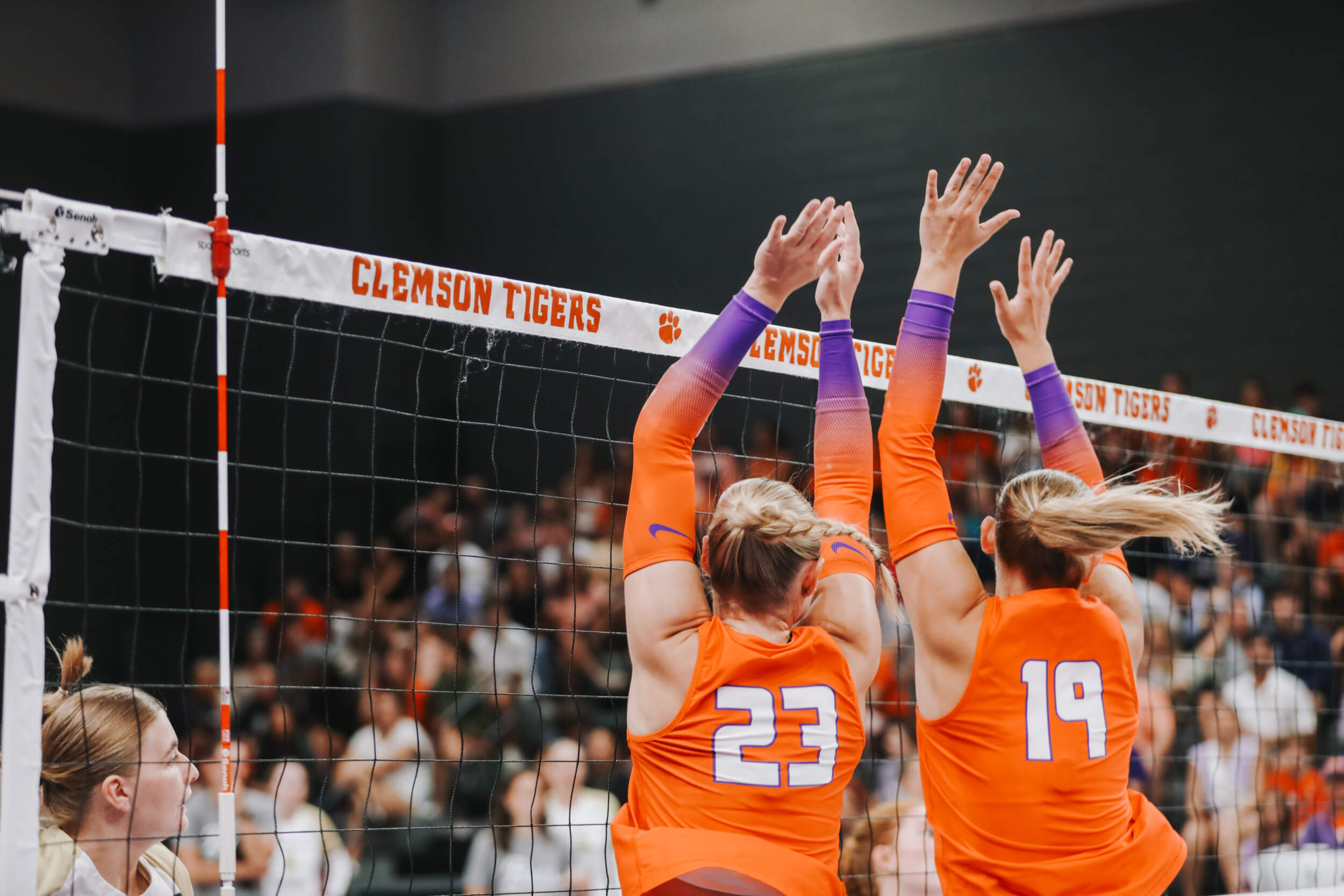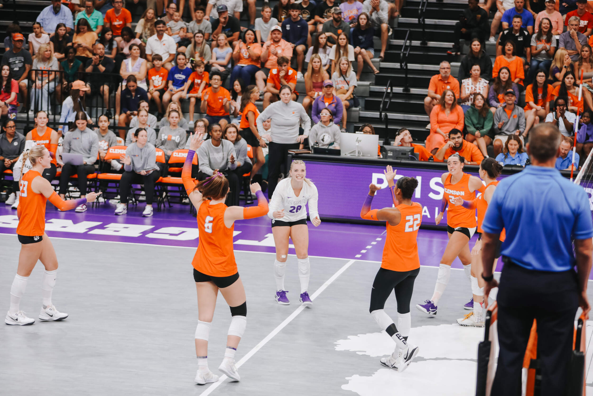 The Tigers started in a dead heat with the Buccaneers in the third set and traded points until it was tied, 9-9. Clemson would then go on an eight-point run powered by a trio of aces from Sandt along with a kill and solo block by Okur. A pair of kills by Hansen, an ace by Addi Rains and a kill each from Sandt and McGrath would put the Tigers on a five-point run to claim the set, 25-13.