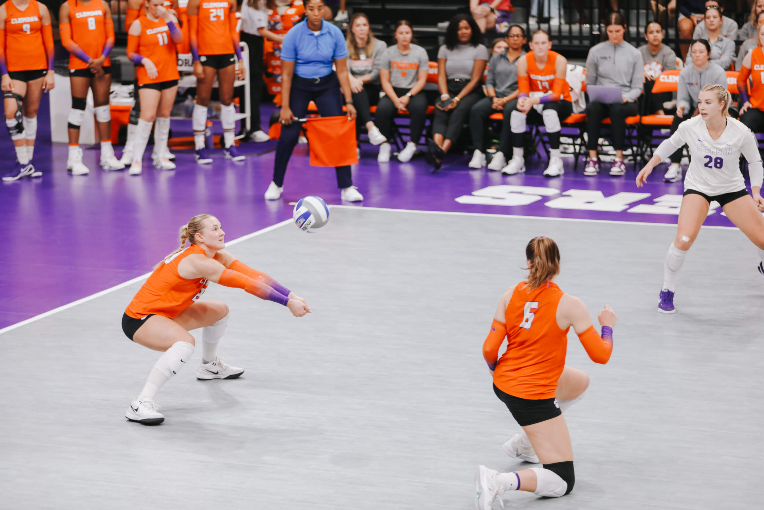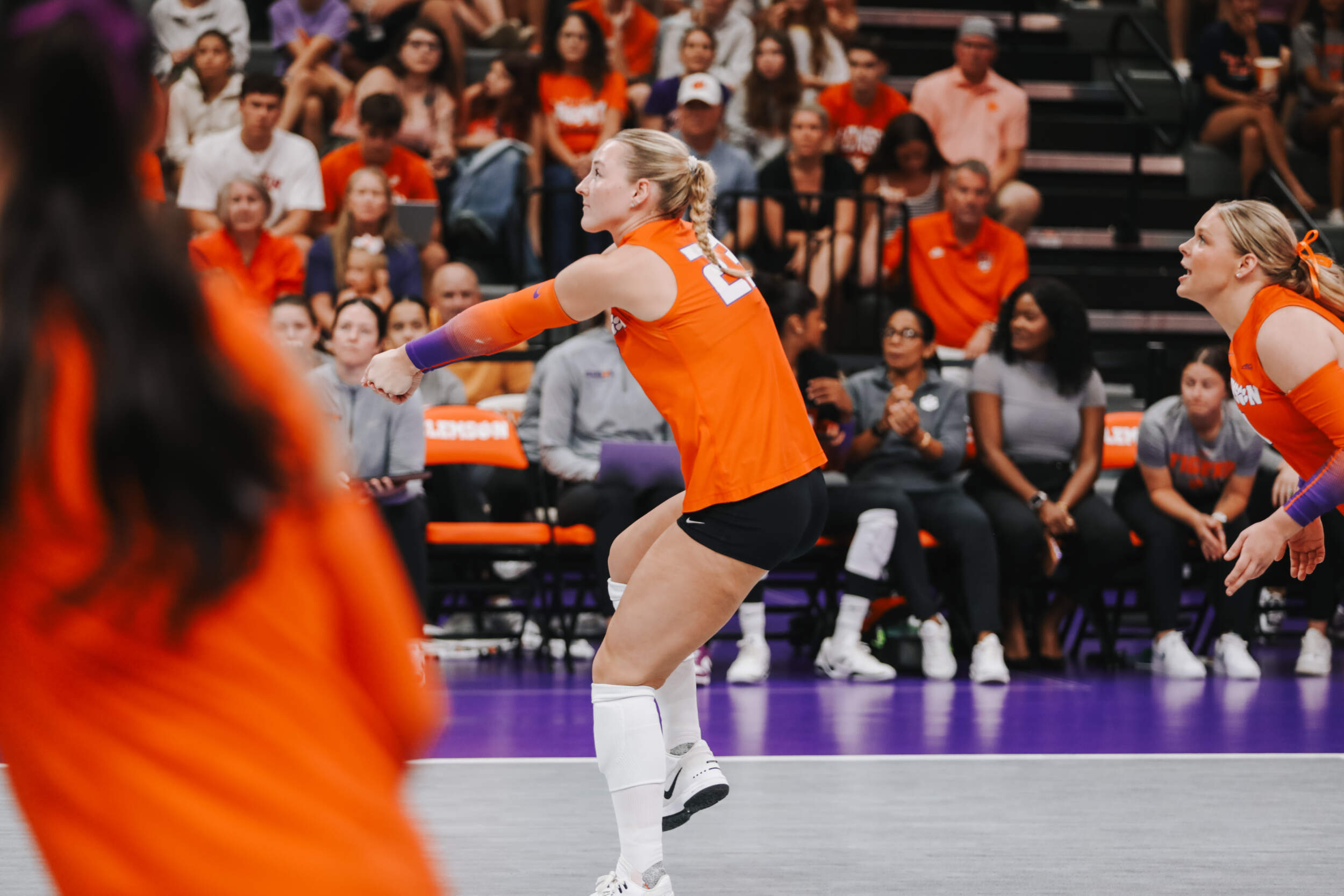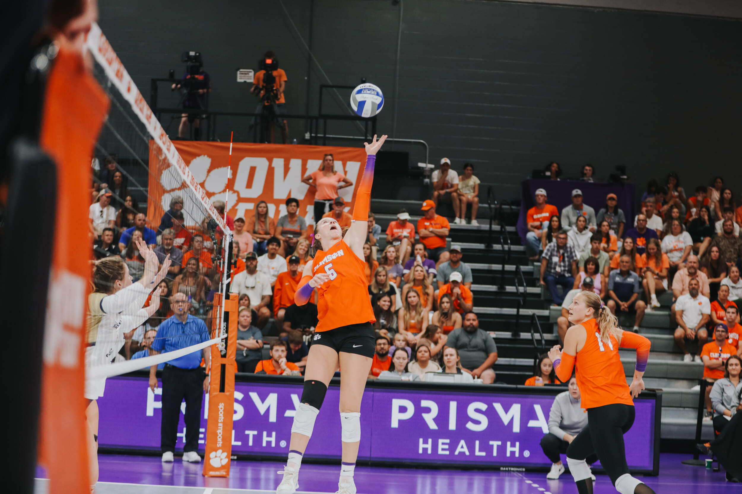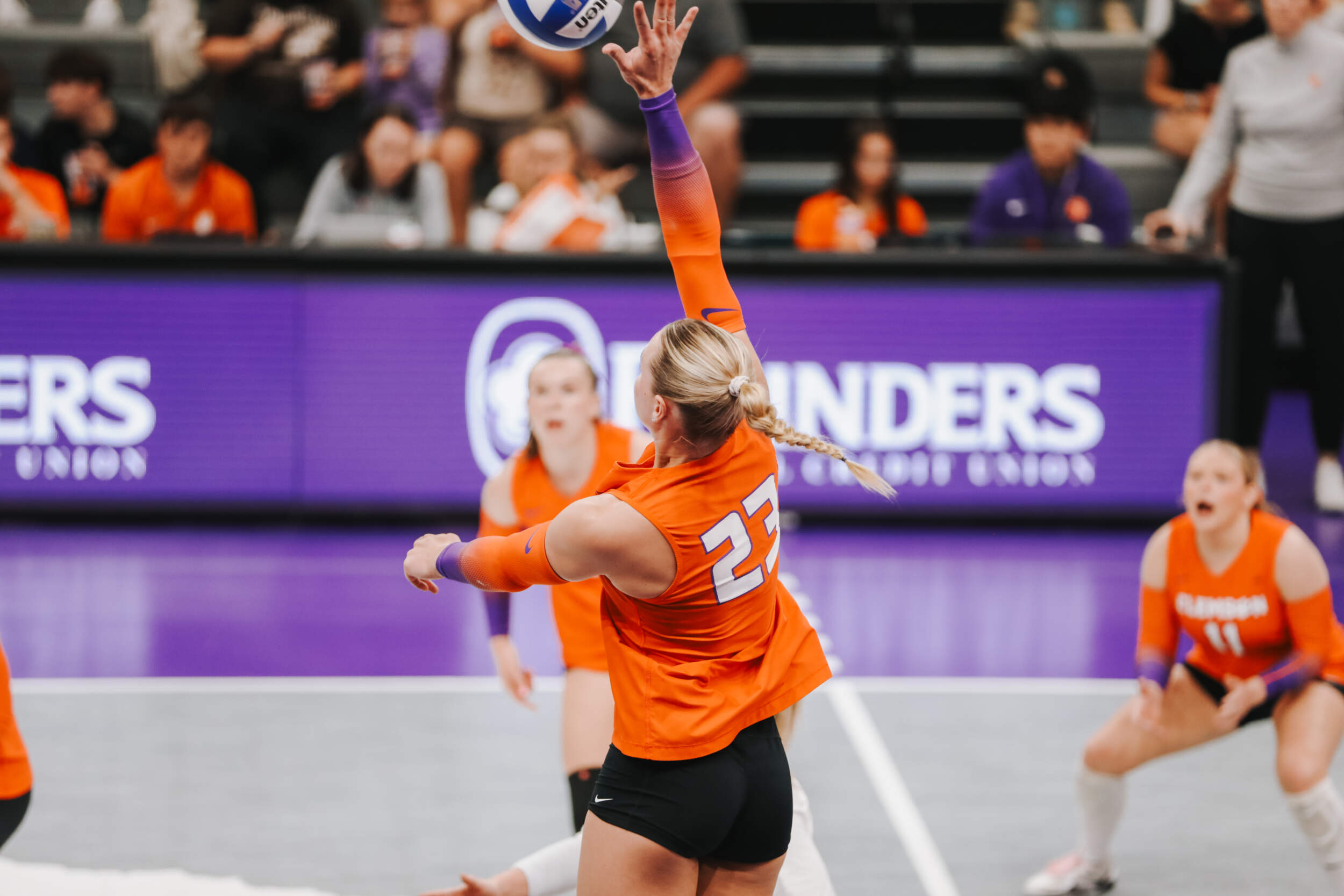 The Tigers started in a dead heat with the Buccaneers in the third set and traded points until it was tied, 9-9. Clemson would then go on an eight-point run powered by a trio of aces from Sandt along with a kill and solo block by Okur. A pair of kills by Hansen, an ace by Addi Rains and a kill each from Sandt and McGrath would put the Tigers on a five-point run to claim the set, 25-13.
