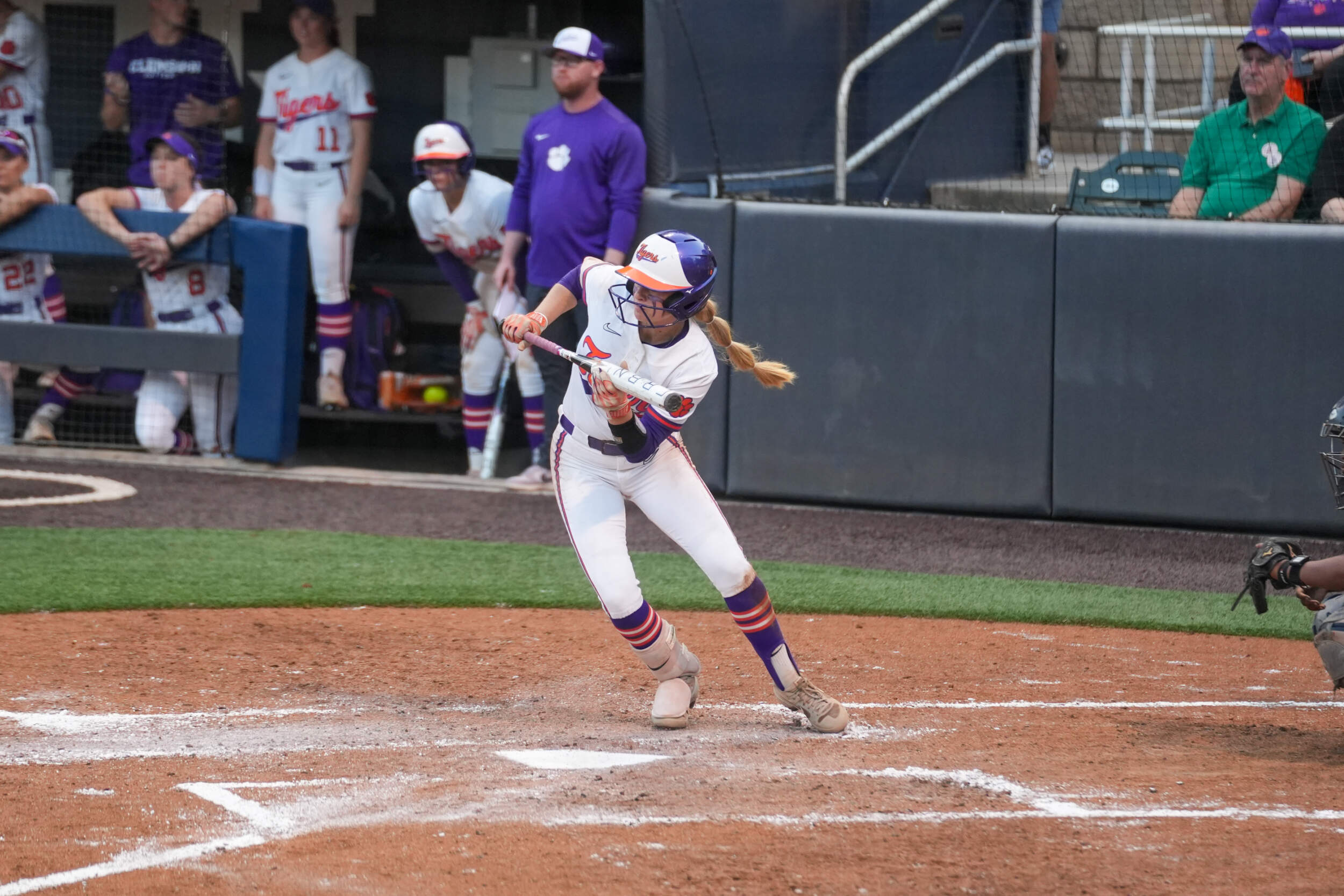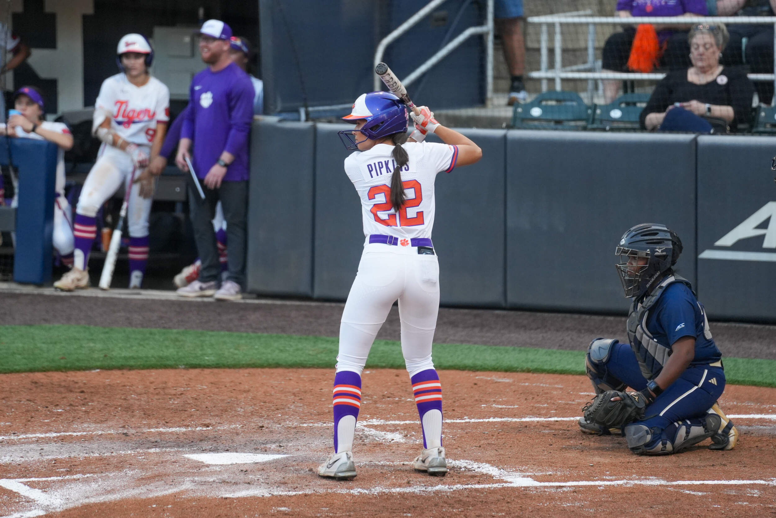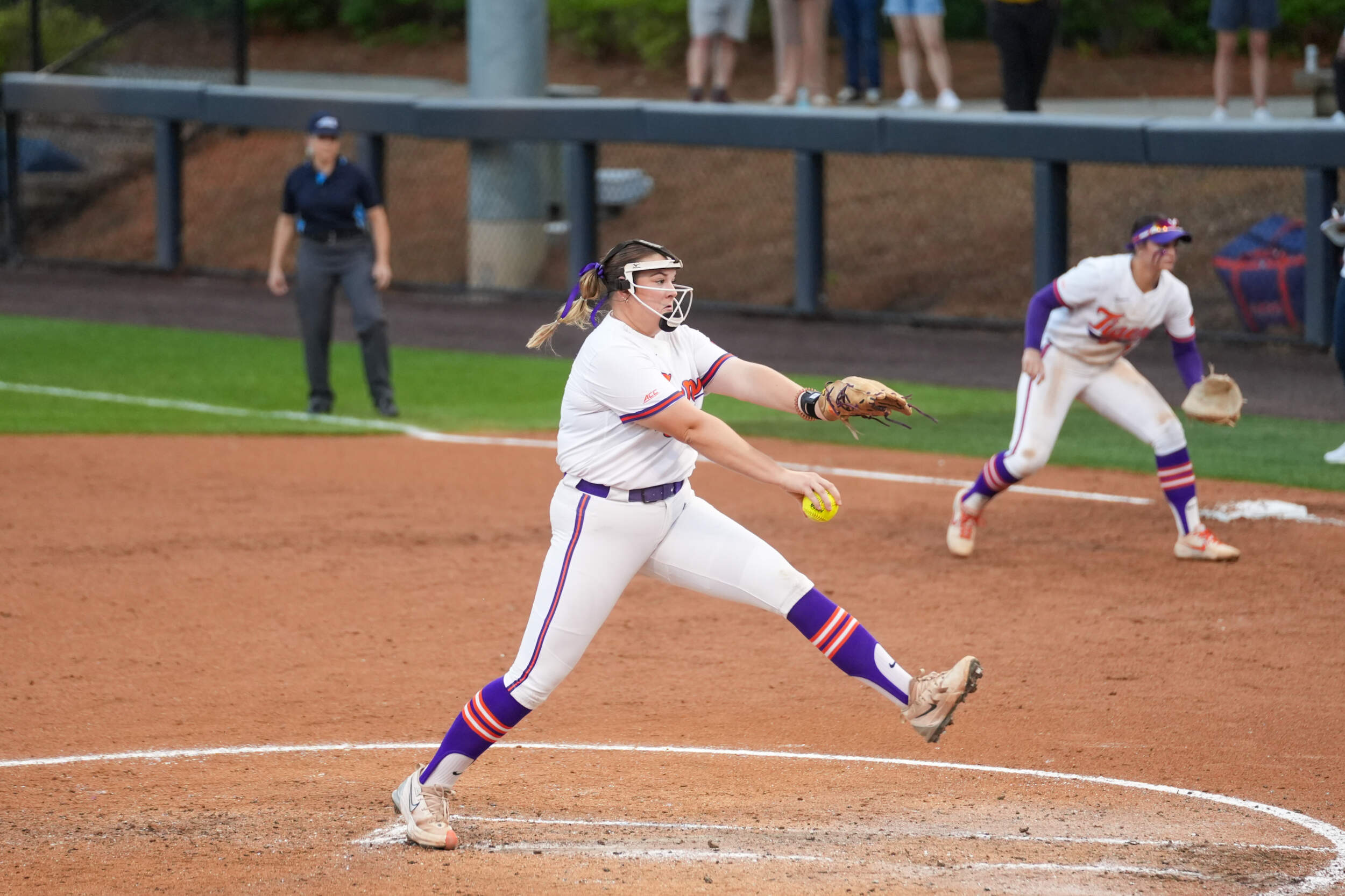 Clemson’s offense continued to add runs in the first, scoring seven total runs throughout the inning. Collins drove the 10th home run of her freshman campaign out of the park for a three-run shot to extend the lead to 5-0. She is the fourth Tiger this season to hit double-digit home runs. Additional runs came off a full count walk to Moore with the bases loaded, and Brockenbrough came home off a wild pitch.