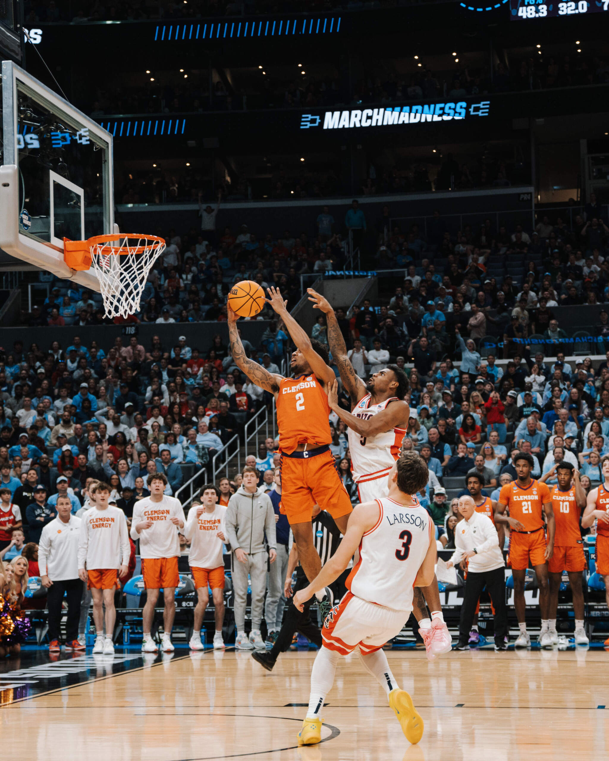 Every Tiger that saw the court scored, as Clemson shot 49.2% from the floor as a team and recorded 17 assists on 29 made field goals. The 17 assists are the most for the Tigers in this year’s tournament. Clemson held Arizona to 37.3% shooting, just 17.9% from beyond the arc, their lowest three-point percentage of the year. The Bears’ 72 points were 15 below their season average, and Clemson held Arizona to just one field goal over an 11-minute stretch in the second half, including 12 straight misses at one point.