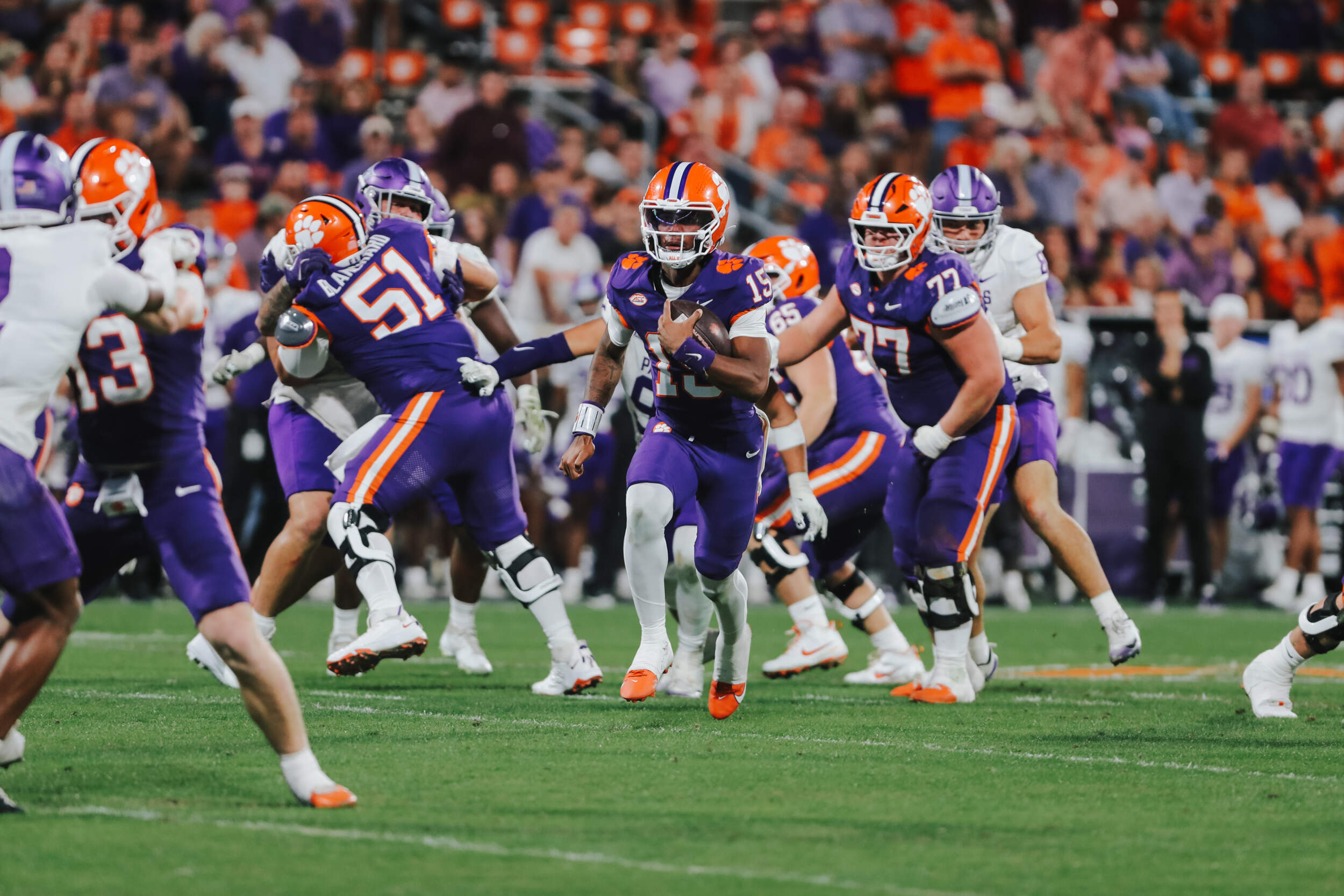 Electric dual-threat quarterback from Florida who played 11 offensive snaps over two games while redshirting in 2025, completing 4-of-4 passes for 22 yards with a touchdown in addition to rushing for 108 yards with a touchdown on seven carries … averaged 17.7 yards per carry against Furman in 2025, the highest by a Clemson quarterback in a game with at least five attempts since Bobby Gage’s 30.3-yard average against Presbyterian in 1947.